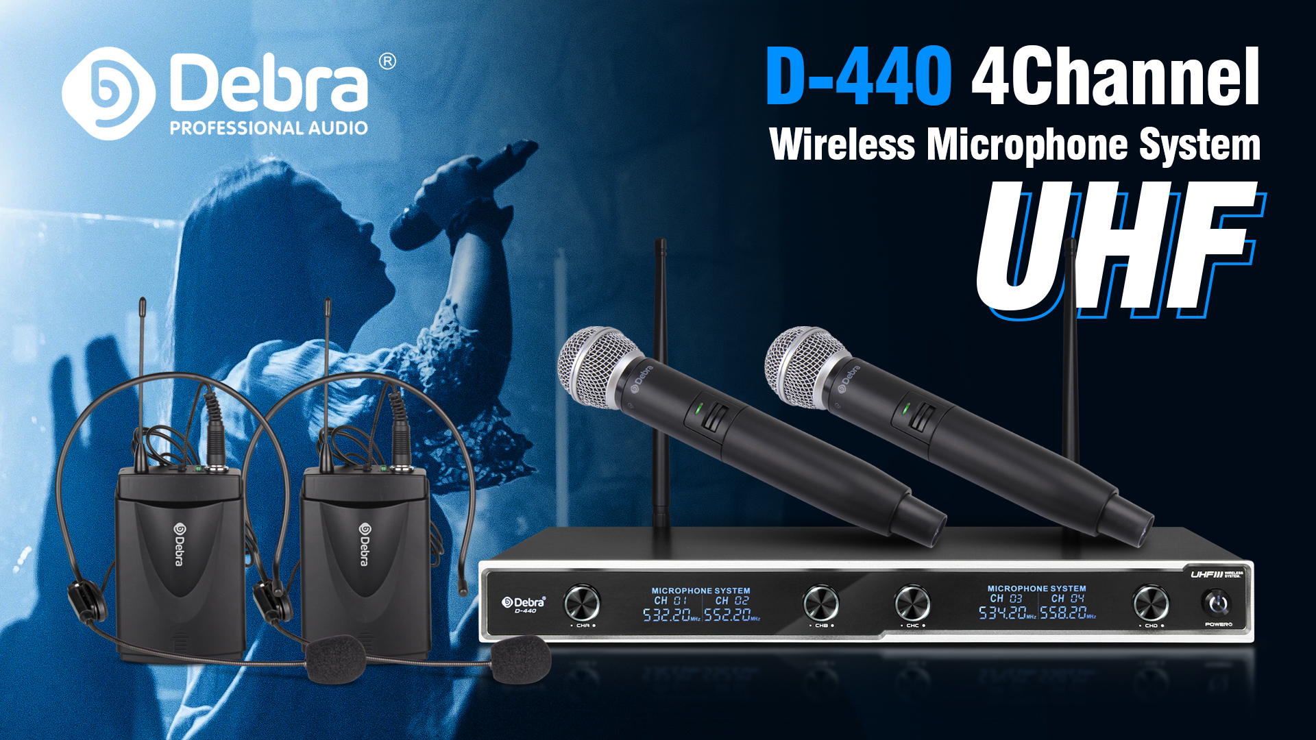 Debra Audio D-440 4 channel wireless microphone system.There series products adopt UHF frequency and use the international standard common frequency which can be used in all over the world. Due to the low frequency and many reasons, traditional wireless any digital equipments. Squelch circuit usually analyzes the intensity of the RF frequency channel instead of the noise and the needed signal. Using the low traditional wireless microphone in the complex environment or when the signal of the microphone is week or the microphone is closed, the squelch circuit many suddenly opened which result the receiver sending out a strong burst of noise. Do not change the frequency when using one set system.It ideal for church, small DJ KJ stage, birthday wedding or family party,conference, classrooms, small karaoke night etc.